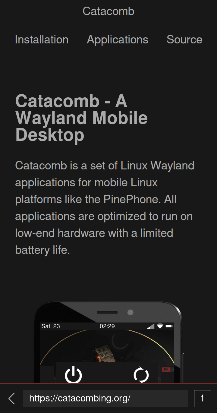 Catacomb is a set of Linux Wayland applications for mobile Linux platforms like the PinePhone. All applications are optimized to run on low-end hardware with a limited battery life.